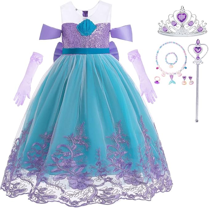 Mit diesem wunderschönen Meerjungfrauen-Kostüm wird jede kleine Prinzessin zur Heldin aus ihrer eigenen Unterwasserwelt. Das Kleid kombiniert glitzernden Lila-Stoff mit türkisfarbenem Tüll und verspielten Stickereien – ideal für Karneval, Mottopartys oder unvergessliche Geburtstage.