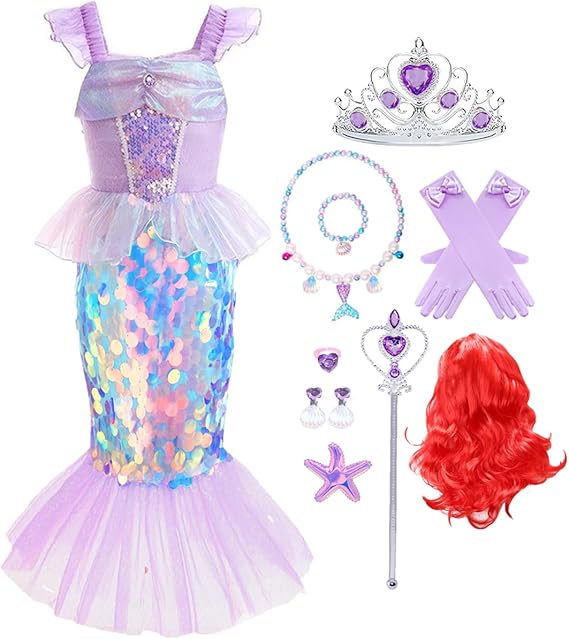 Verwandle kleine Träumerinnen in echte Meerjungfrauen mit diesem bezaubernden Set: Ein lila Meerjungfrauen-Kleid mit passendem Zubehör – Krone, Stern-Zauberstab, Ring, Muschel-Armband, Muschel-Halskette und Muschel-Ohrringe. Hinzu kommt der Rimmel Lip Art Glitter Lipgloss „wicked“, für schimmernde Lippen wie ein Unterwasser-Juwel.